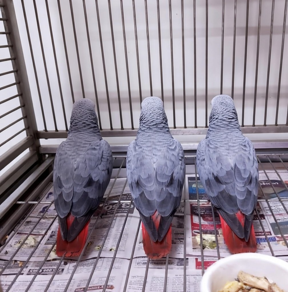 These baby African Grey parrots currently display soft grey plumage with subtle edging, large dark eyes (which will gradually turn bright yellow as they mature), and a smooth black beak. They will grow into medium-sized parrots reaching about 33 cm (13 inches) in length, with a striking bright red tail that becomes a beautiful feature in adulthood. Weighing around 400–600 grams when fully grown, they have a lifespan of 50+ years, becoming true lifelong companions.